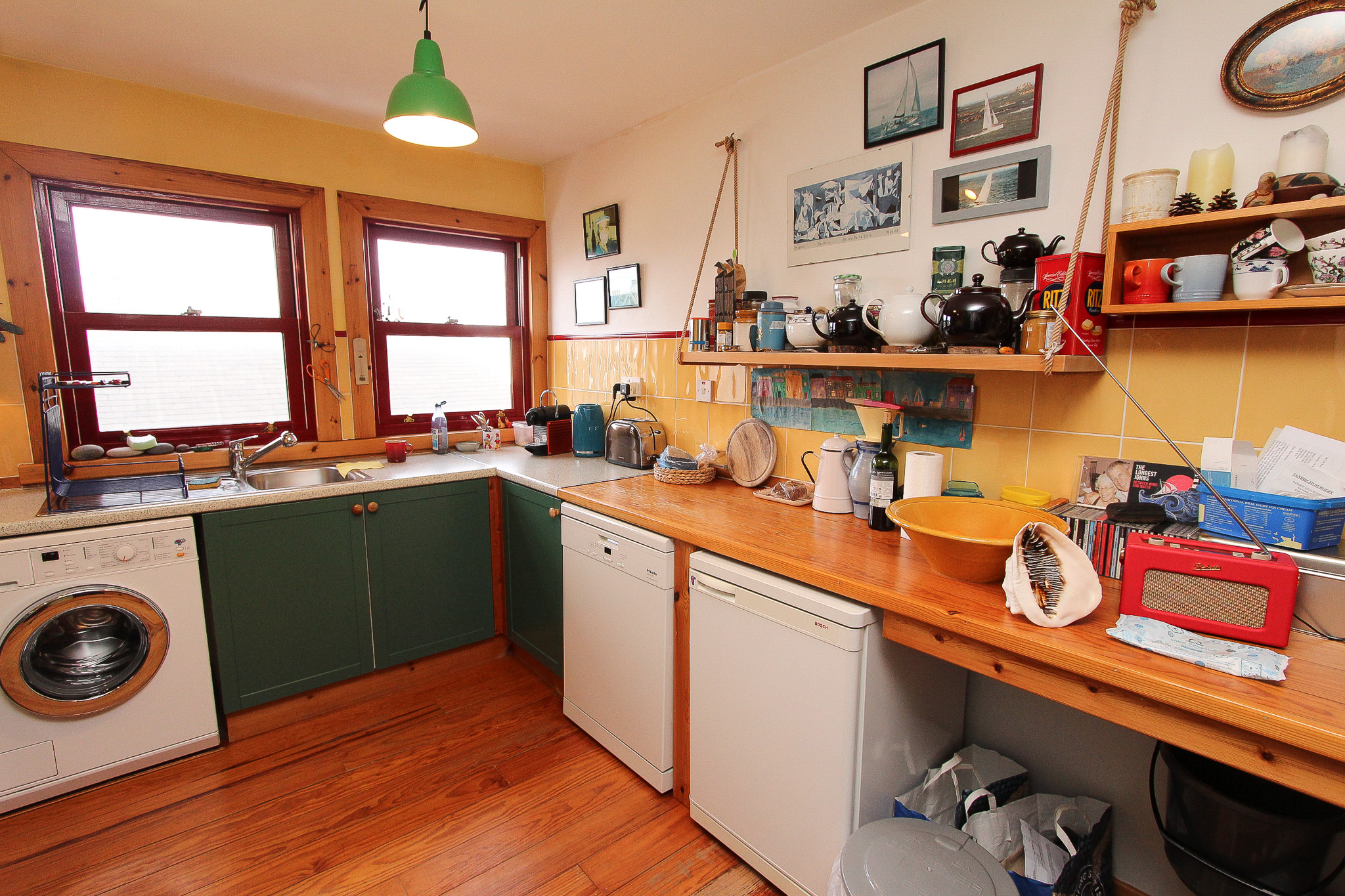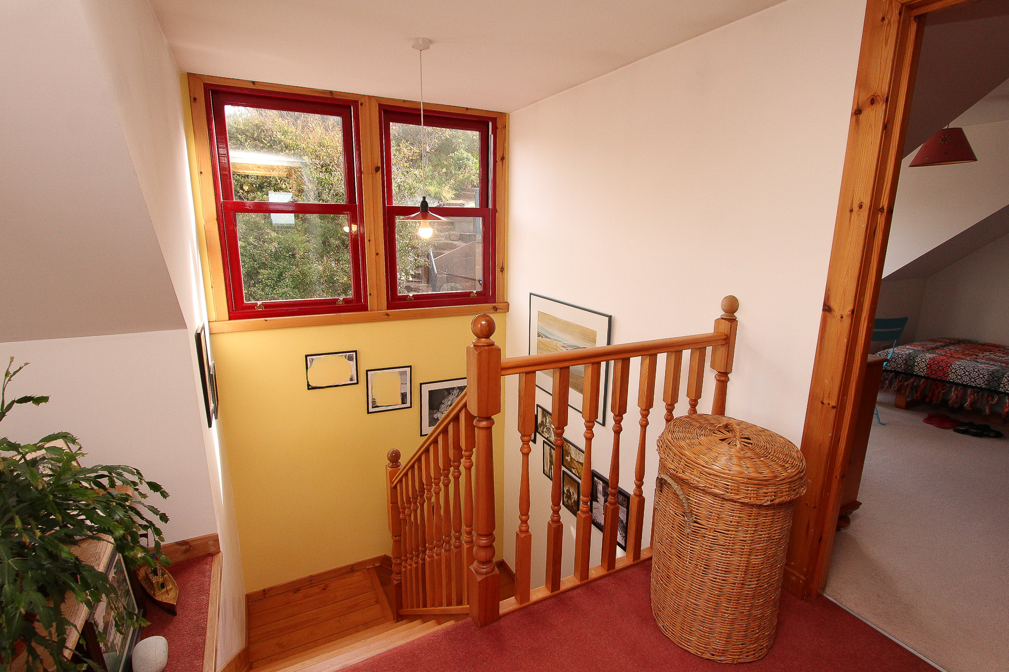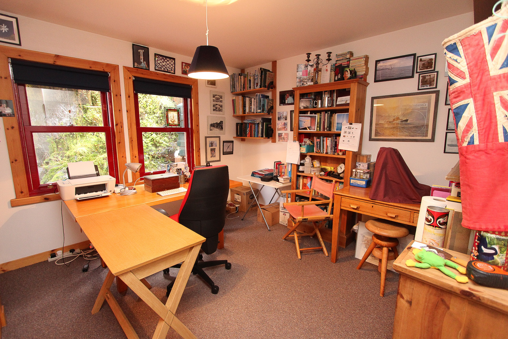 Step outside to discover a generously proportioned terraced garden ground. Offering a seamless blend of natural beauty and functionality, the garden overlooks the village and North Channel beyond, inviting residents to unwind amidst the stunning vistas. Accessible from street level and via a charming bridge from the dining room, the garden beckons with its array of patios, adorned with natural bluebell and willow borders. Ascend the sandstone steps, graced with iron railings, to explore the various terraces, one of which features a tranquil garden pond.