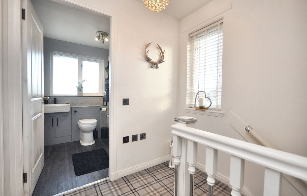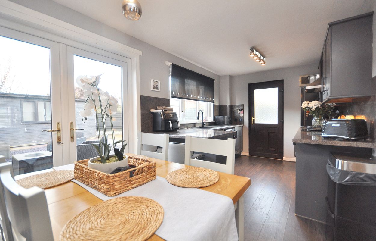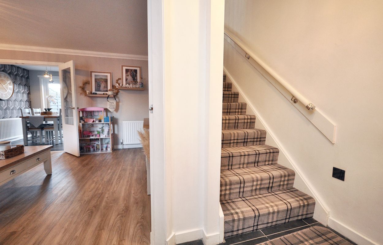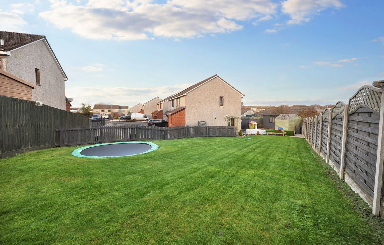 The outside space of this property offers a generously sized and well-maintained garden with a corner plot layout. The concrete paved pathway and patio are surrounded by gravel border to the rear, leading to a recently installed timber garden store and separate storage shed, both enclosed by panel fencing. A pathway extends to a raised paved patio, connecting to a large maintained lawn area with planting border. The property also features a generous tarmac driveway at the front, facilitating ample parking space for multiple vehicles, alongside a raised gravel border for added aesthetic charm.