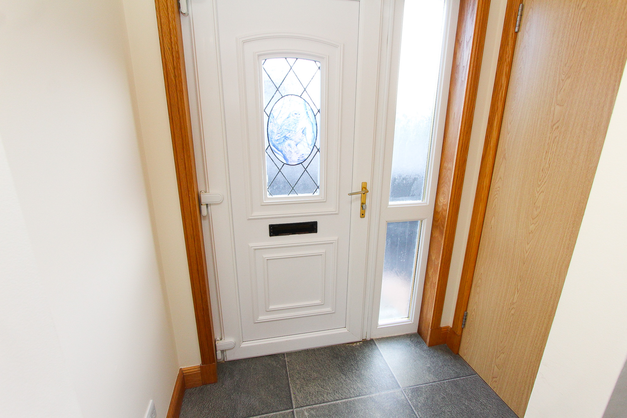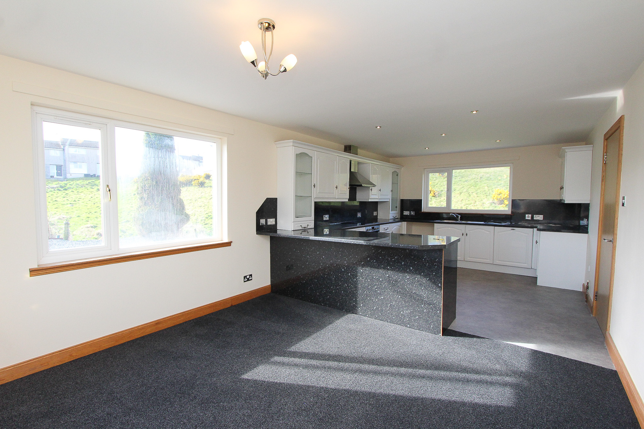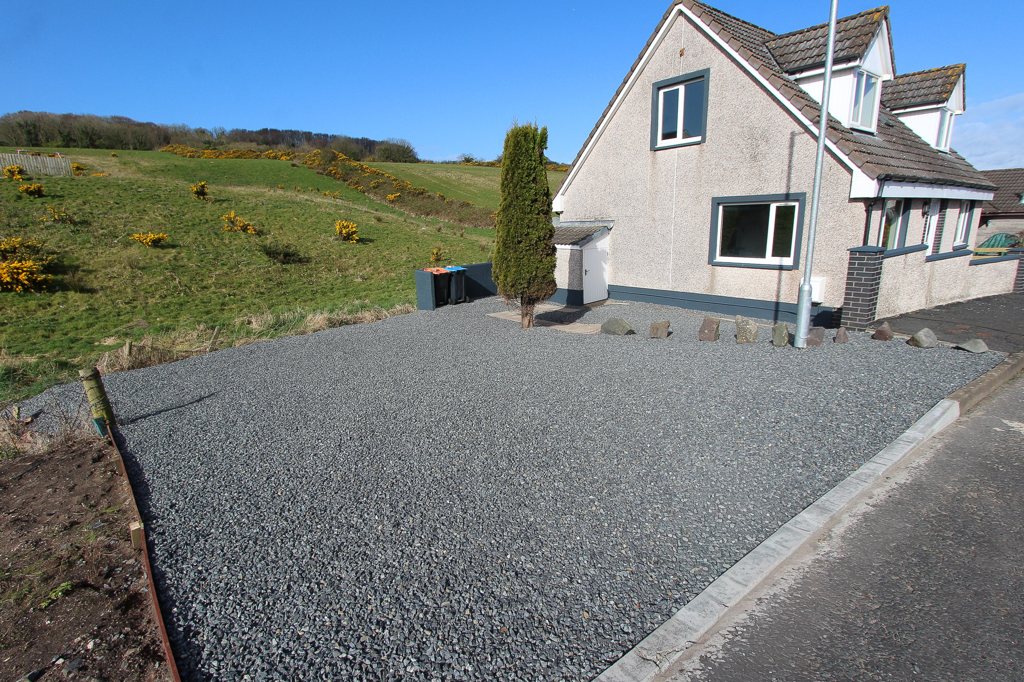 Outside, the property is set amidst its own garden grounds, designed for ease of maintenance. The front and rear gardens are attractively laid out with a combination of monobloc paving and gravel, providing a smart, low-maintenance environment that is perfect for relaxing or entertaining outdoors. To the side of the house, a further area of garden ground has been prepared and scraped clean, offering a blank canvas for new owners to landscape and develop according to their preferences. Ample off-road parking is available on both sides of the property, ensuring convenience for multiple vehicles or visiting guests.