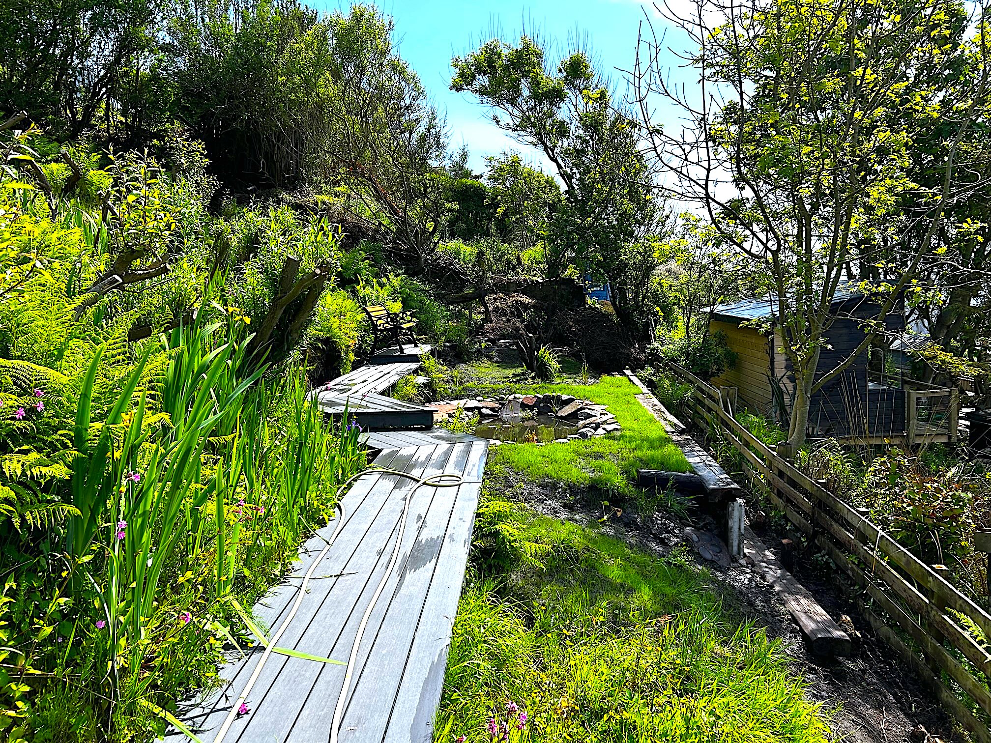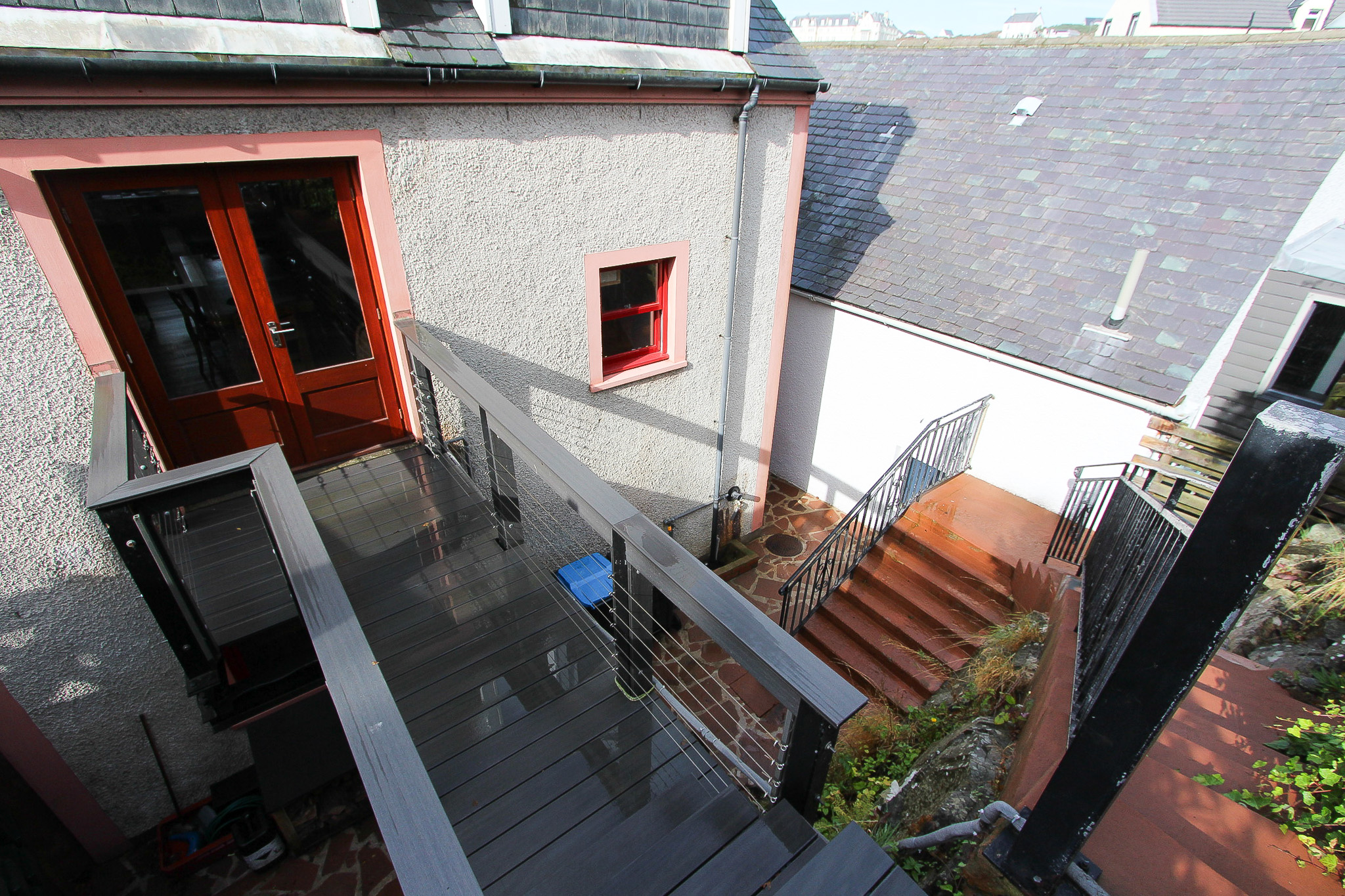 Step outside to discover a generously proportioned terraced garden ground. Offering a seamless blend of natural beauty and functionality, the garden overlooks the village and North Channel beyond, inviting residents to unwind amidst the stunning vistas. Accessible from street level and via a charming bridge from the dining room, the garden beckons with its array of patios, adorned with natural bluebell and willow borders. Ascend the sandstone steps, graced with iron railings, to explore the various terraces, one of which features a tranquil garden pond.