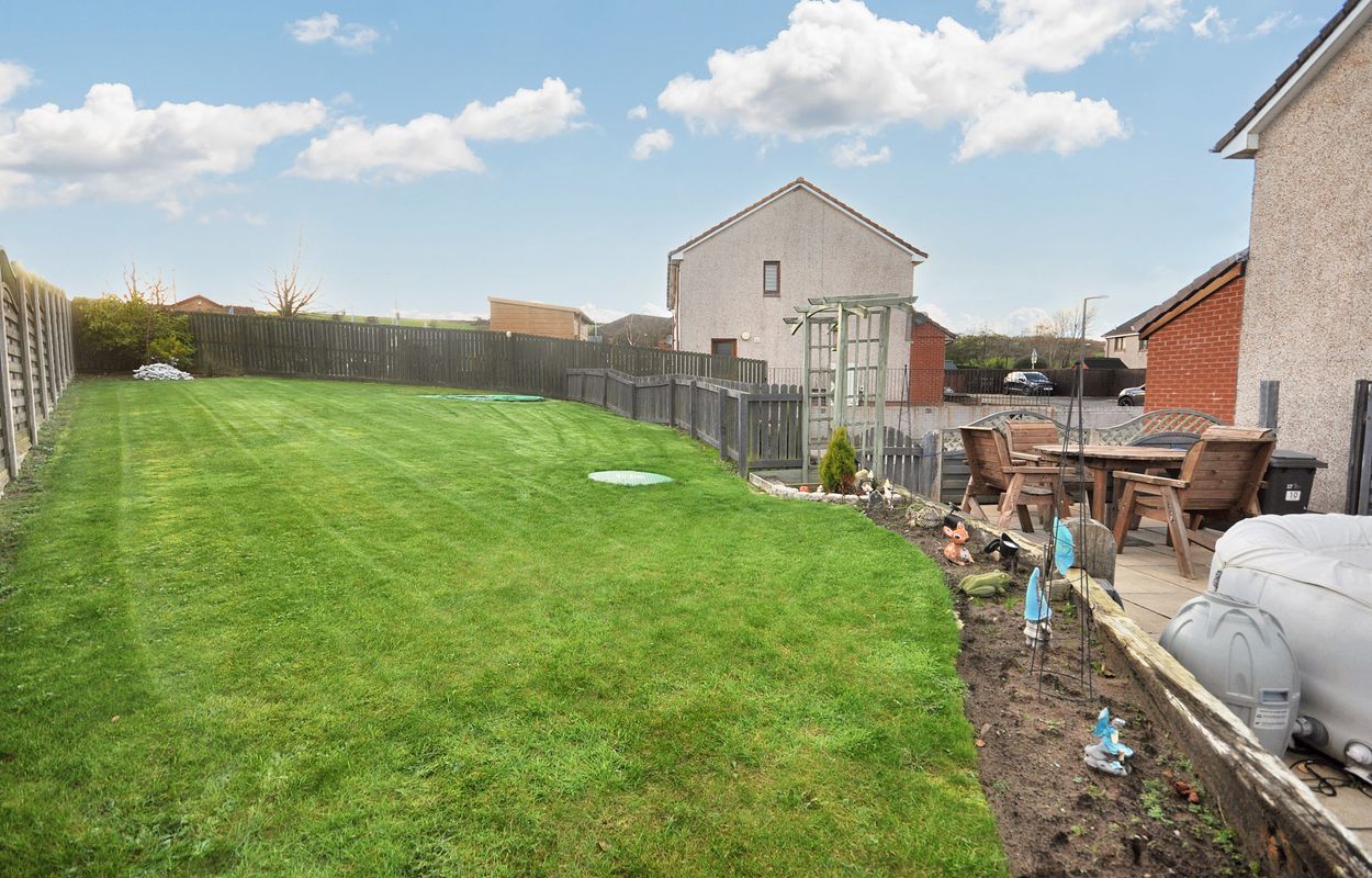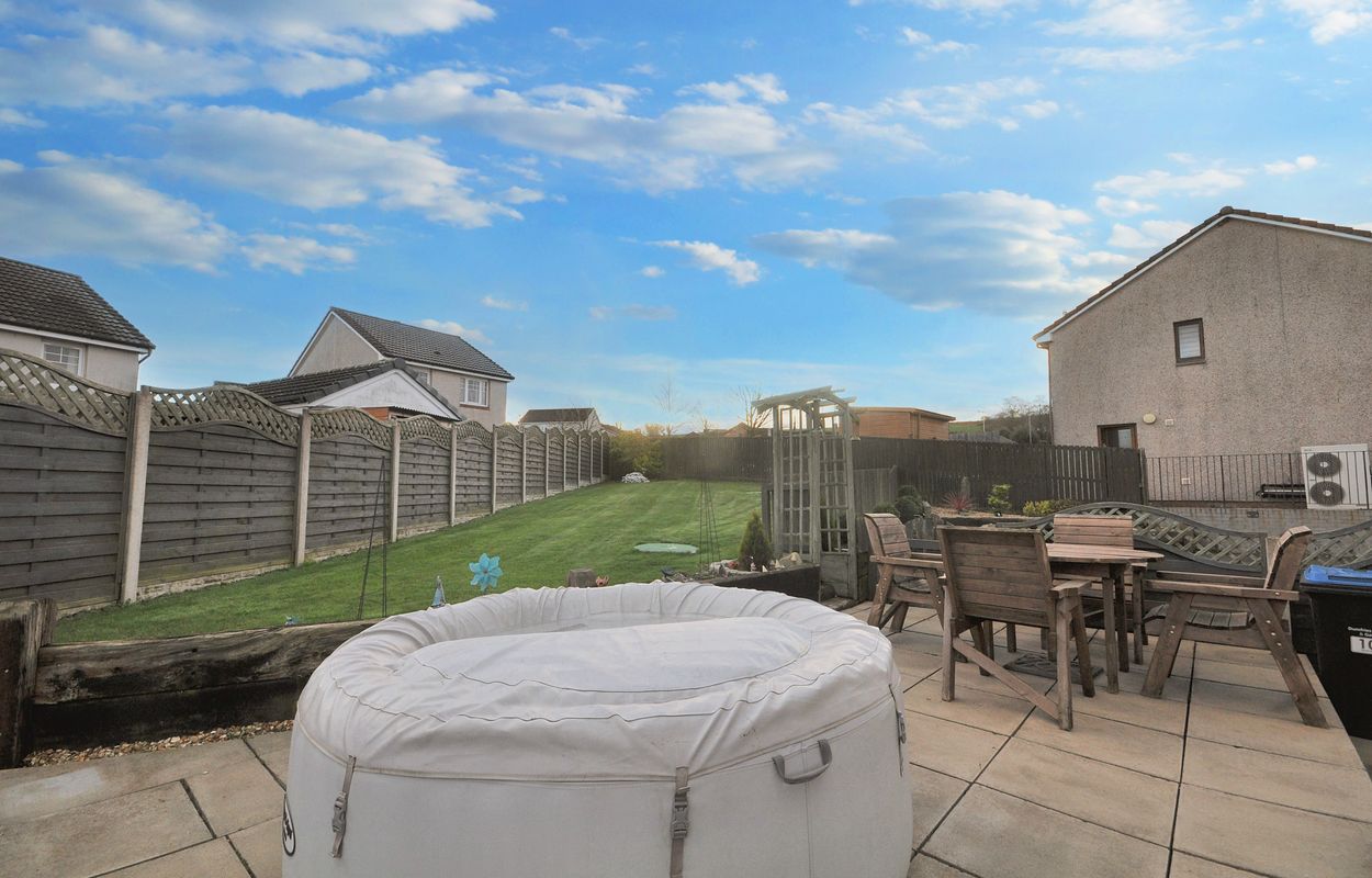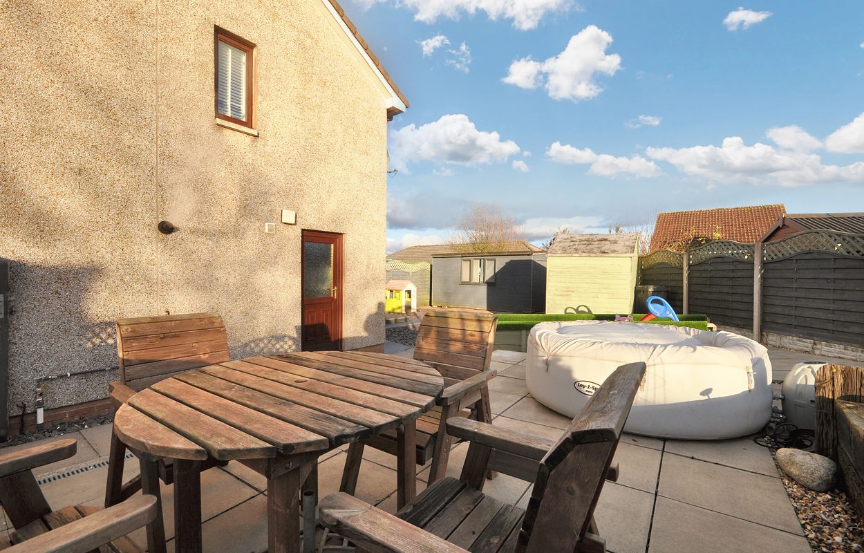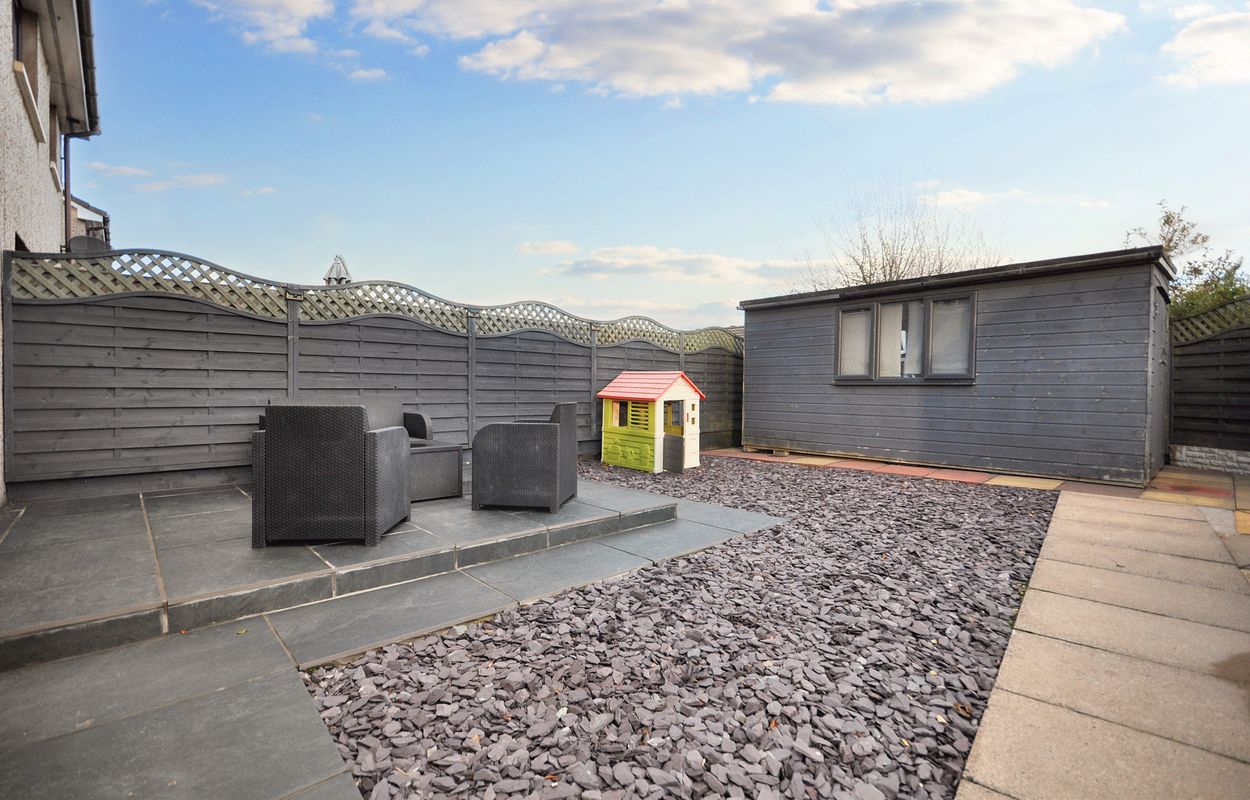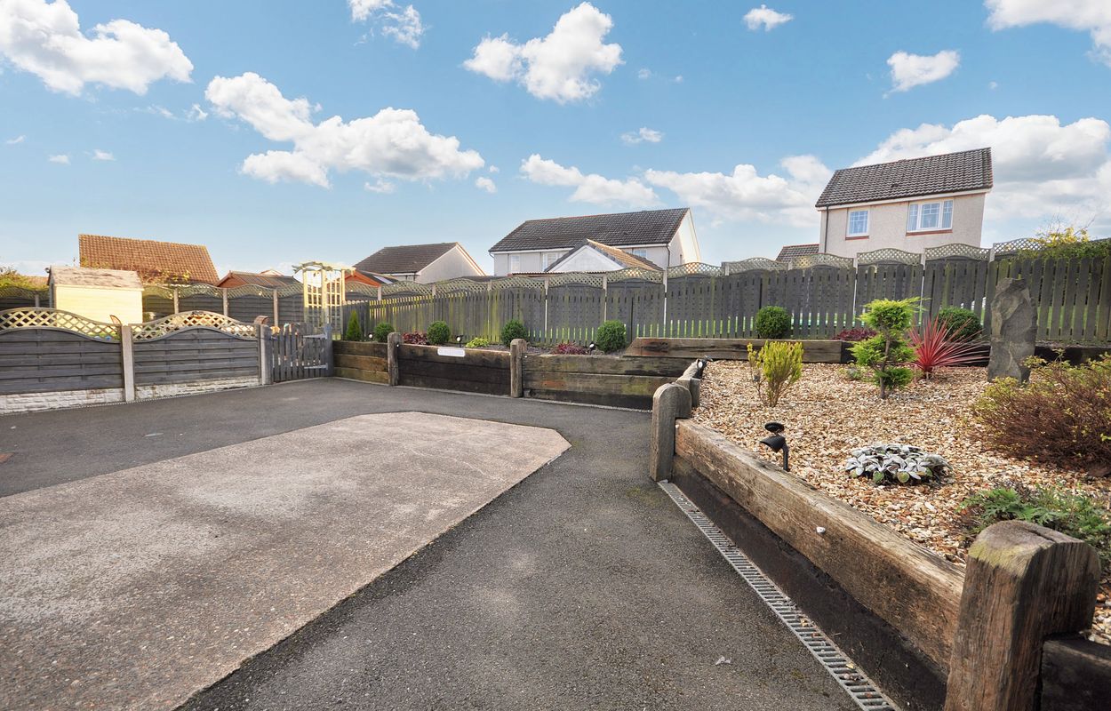 The outside space of this property offers a generously sized and well-maintained garden with a corner plot layout. The concrete paved pathway and patio are surrounded by gravel border to the rear, leading to a recently installed timber garden store and separate storage shed, both enclosed by panel fencing. A pathway extends to a raised paved patio, connecting to a large maintained lawn area with planting border. The property also features a generous tarmac driveway at the front, facilitating ample parking space for multiple vehicles, alongside a raised gravel border for added aesthetic charm.
